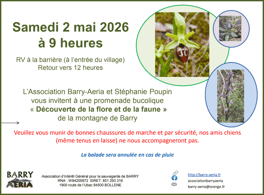 Barry-aéria est une association à but non lucratif d’environ 165 adhérents ayant pour but de promouvoir le massif de Barry. Nous aidons activement à la sauvegarde des vestiges et particularités historiques du massif de Barry. Nous diffusons la connaissance auprès d’un large public dans les domaines : historique, archéologique, géologique, ethnologique, environnemental et paysager.